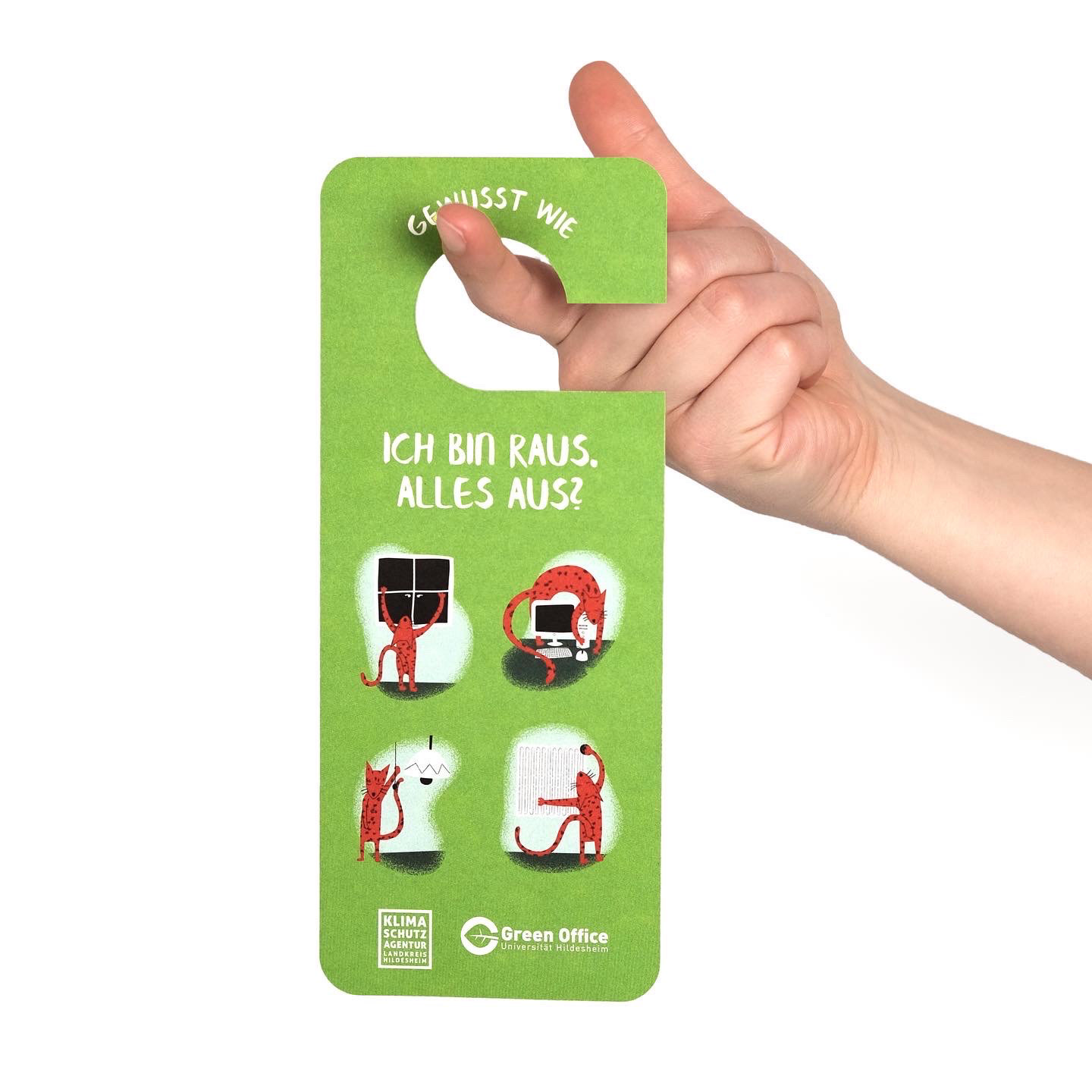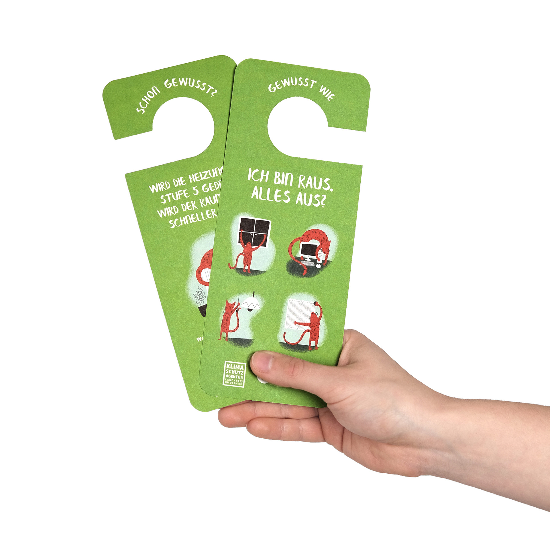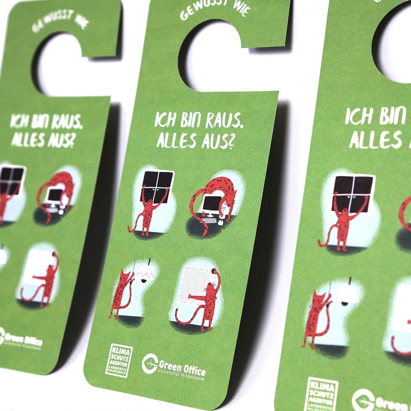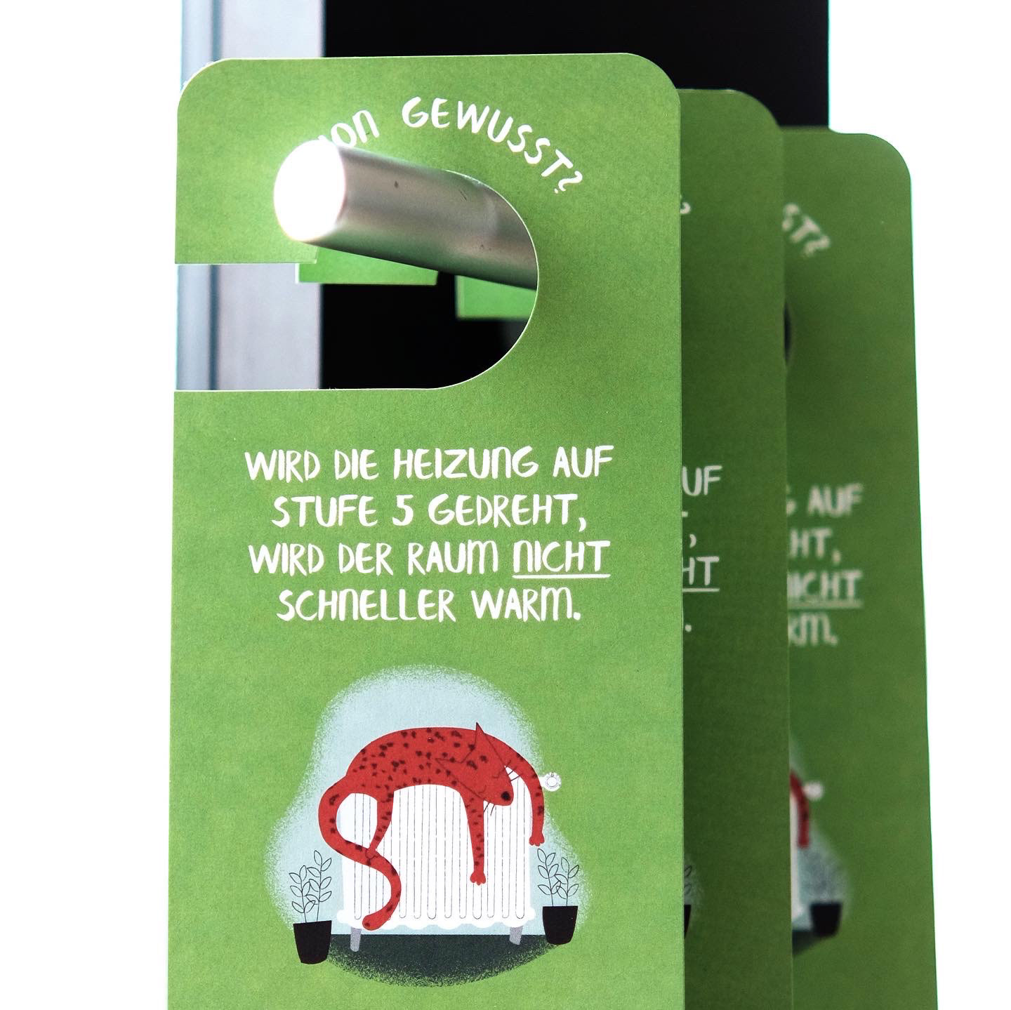 Illustration: Türanhänger für die Büroräume der Universität Hildesheim. Die Illustrationen sollen zum Energie- und Gassparen animieren.